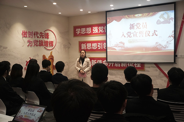 为激励党员践行入党誓词、坚定入党信念、激发爱国情怀,12月14日中午,机械与电气工程学院党总支在今年会官网“一站式”学生社区红色驿站举行新党员入党宣誓仪式,机电学院党总支书记严红霞、第一党支部书记邓蓉蓉及26名学生党员参加仪式,仪式由邓蓉蓉老师主持。