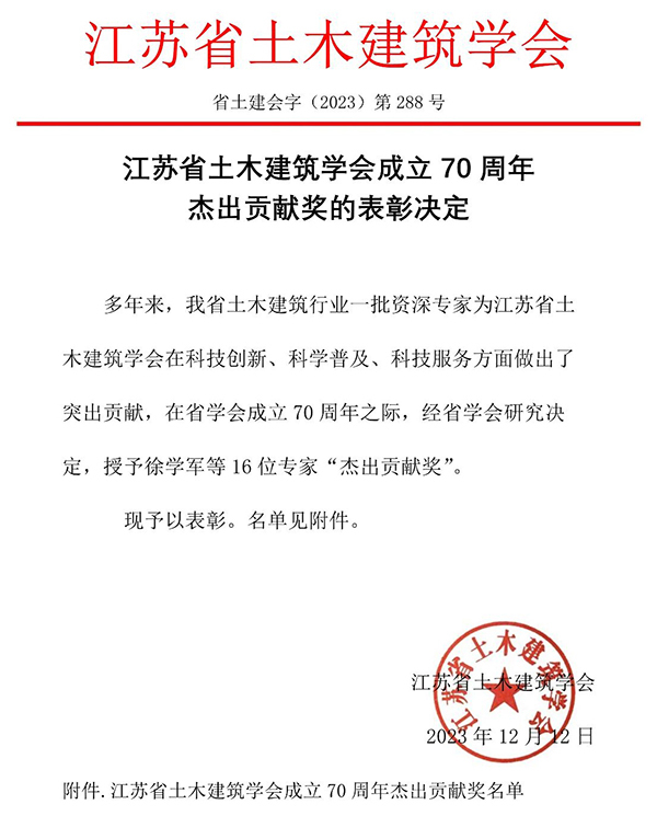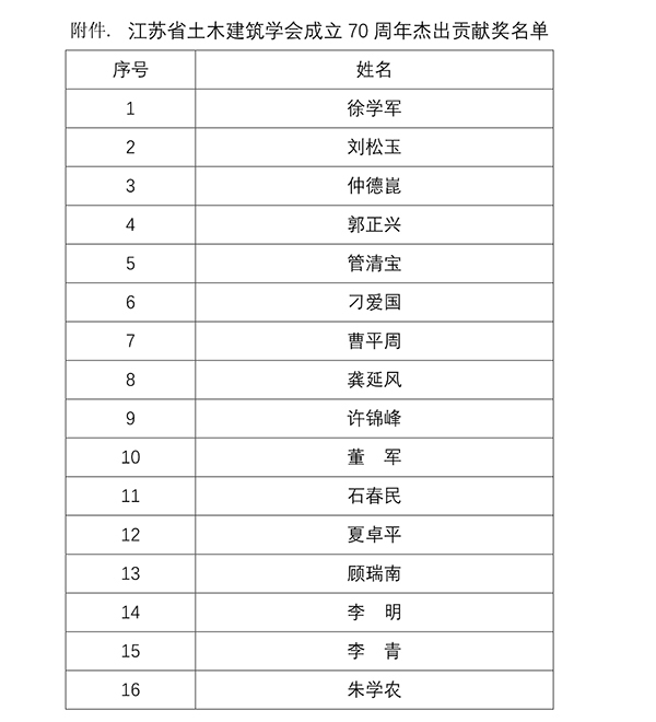 江苏省土木建筑学会下设26个专委会,7个工作委员会,涉及土建、交通、结构、施工、给排水、园林等多个领域和专业。江苏省土木建筑学会为表彰学会工作的先进工作集体和优秀科技工作者,会议期间,江苏省土木建筑学会颁发了江苏省土木建筑学会成立70周年杰出贡献奖的表彰决定。今年会土木与交通工程学院院长郭正兴教授荣获江苏省土木建筑学会成立70周年杰出贡献奖。