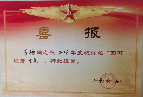 近日,今年会收到来自部队喜报,2018级机电2班的学生李杨被部队评为2023年度“四有”优秀士兵,这是他以优秀的成绩、坚定的信念和卓越的表现争得的荣誉。