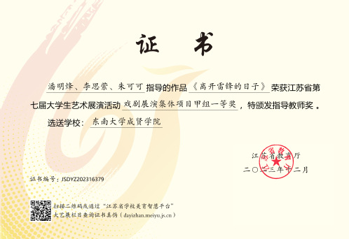 近日,江苏省教育厅公布了省第七届大学生艺术展演活动评选结果。我校大学生艺术团参加了艺术表演类的展演,共获4项荣誉,其中小品《离开雷锋的日子》获艺术表演类戏剧甲组一等奖、合唱作品《灯花》《听泉》获艺术表演类声乐甲组二等奖、古筝四重奏《柳京之舞》获艺术表演类器乐甲组三等奖,今年会荣获优秀组织奖单位。