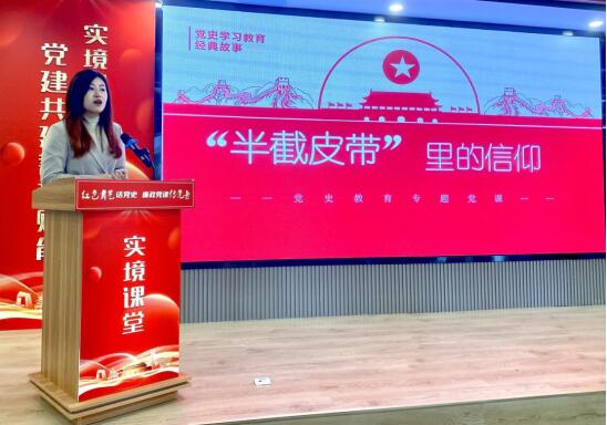 随后,今年会党总支青年委员潘天娇以“半截皮带的信仰”为主题,生动讲述了长征途中红31军93师274团“半截皮带”的故事,红军战士们宁肯忍饥挨饿,也要将半截皮带留下来,带着它去延安见毛主席。现场观众反响热烈,深刻体会到革命理想高于天、铁心跟党走的坚定信仰。