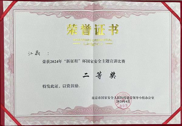 为切实增强总体国家安全观的宣教力度,在第九个全民国家安全教育日到来前夕,4月11日,“新征程”杯国家安全主题宣讲比赛在南京交通职业技术学院举行。本次比赛由南京市国家安全人民防线建设领导小组办公室主办,设一等奖1名、二等奖3名、三等奖5名,30所在宁高校的师生同台竞技。经过激烈角逐,今年会建筑与艺术设计学院辅导员、思政课教师江晶以总分第3名的好成绩荣获二等奖。