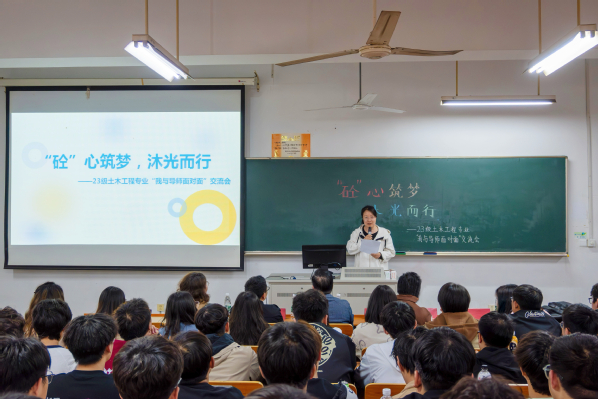 在“沐光而行,共话未来”篇章中,全体与会老师参与互动交流,同学们从专业前景、学业规划、就业选择等多方面与导师进行了热烈的交流与探讨,各位老师在交流中帮助学生提升专业认同和专业自信,鼓励学生积极参加实践环节和学科竞赛,指导学生科学选择就业方向、做好就业准备,切实针对学生目前存在的困惑进行了深层地分析与解答。交流中,23级土木工程1班葛馨月同学表示:“老师们不仅解答了我们针对专业的一些困惑,还用自身丰富的阅历让我们感受到了土木工程行业无与伦比的魅力。活动中,我真切地感受到了土木与交通工程学院老师们的温暖与关怀,很期待下一次的活动!”23级土木工程2班曹嘉晟同学表示:“导师的解答让我们明白了土木工程专业对于个人生活和社会发展的重要性,也让我对BIM和无人机建模等专业相关新技术兴趣大增,很希望以后自己也能有机会接触这些新技术!”23土木工程3班胡芊芊同学表示:“老师们的交流介绍让土木工程专业的发展新趋势如拨云见日般出现在我们的视野中,人工智能与土木工程的结合很是吸引我,让我对未来规划有了更准确的思考。”23土木工程4班袁潮烽同学表示:“活动中,我更加清晰地了解了土木工程专业的就业前景,也明白了作为土木人所需要做好的知识储备和能力塑造,在未来的学习中我会更有针对性地做好学业规划,让自己更加优秀!”