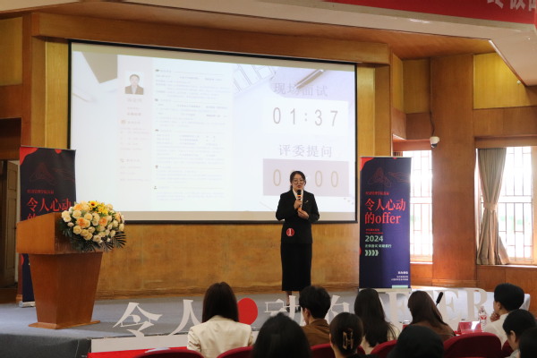 最后,潘天娇老师进行总结点评,对选手们的表现给予了充分肯定,并希望同学们以此活动为契机,加强自我认知和职业探索,强化求职行动力,力争将个人职业发展融入国家发展大局。