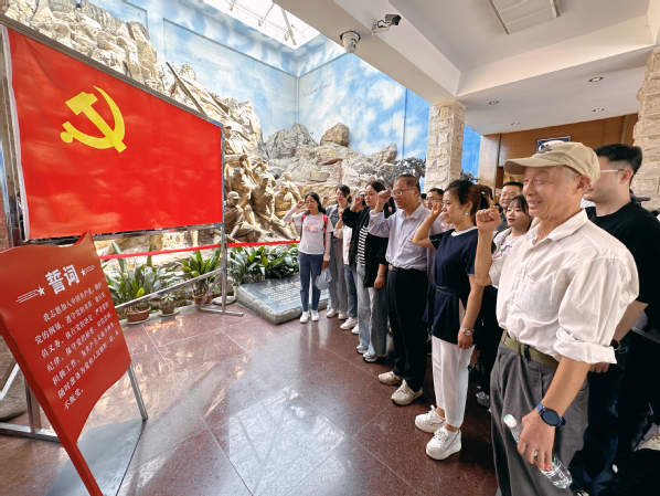 参观结束后,党员同志在土木与交通工程学院院长郭正兴教授的带领下在现场举行了庄严的重温入党誓词宣誓仪式。面对鲜红的中国共产党党旗,大家举起右拳,庄严宣誓,铮铮誓言铿锵有力,久久回荡。