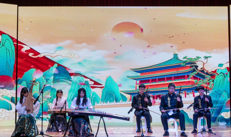古筝合奏《浏阳河》拉开音乐会序幕,琴弦细腻如春蚕吐丝,悠扬的旋律跃入人心。演奏者巧妙地运用不同的技法,形成鲜明的对比,使乐曲具有更强烈的感染力,深情地表达了对家乡和对生活的热爱。二胡演奏《水龙吟》气势磅礴、恢弘大气,演奏者以娴熟的技艺和饱满的热情展现了中华民族不屈不挠、勇往直前的精神面貌。《钢水奔流》旋律富有朝气、节奏铿锵有力,歌颂了钢铁工人的豪迈气概和冲天干劲。民乐合奏《万疆》用悠扬的旋律勾勒出山河无恙的盛世景象,表达了对祖国蒸蒸日上的赞美与自豪。《人生的旋转木马》节奏轻盈、旋律优美、气氛明快,表达出生命的欢乐与活力。作为结束曲目的《友谊地久天长》用悠扬婉转的旋律展示了友谊的真挚与美好,让在场的观众深受感动。纵使岁月如梭,但友情永存,带着挚友的期待与祝福,不断探索,敢于冒险,勇往直前。