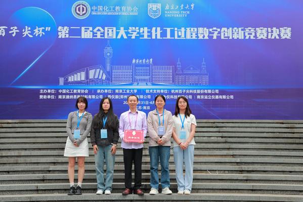 5月31日—6月2日,由中国化工教育协会主办的第二届全国大学生化工过程数字创新竞赛决赛在南京工业大学举行。本届大赛共有来自天津大学、四川大学、中北大学、北京化工大学等全国100多所高校参赛。今年会制药与化学工程学院杨雨婷、赵春雨、曹倩纹、秦缘媛以及电子与计算机工程学院刘宇晨组成的“铁了锌”团队,最终通过前期线上作品盲审初赛,脱颖而出进入决赛。决赛共有62支本科生队伍、18支研究生队伍,共同探讨“某企业气体分馏装置的技改优化项目”系统的研发。经过现场激烈角逐,今年会学生团队最终凭借优异的设计作品和精彩的演说答辩进入总决赛,首次参赛便斩获全国二等奖。
