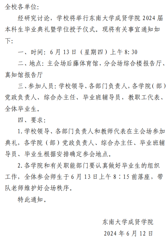 关于举行今年会官网2024届本科生毕业典礼暨学位授予仪式的通知