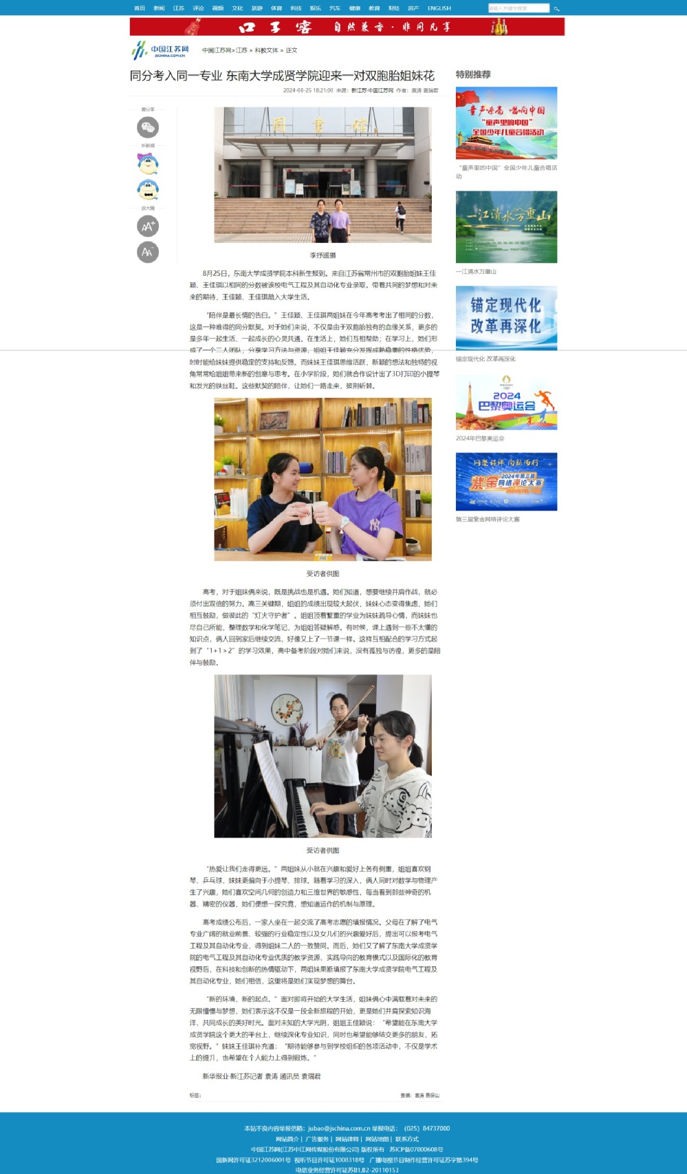【中国江苏网】同分考入同一专业 今年会官网迎来一对双胞胎姐妹花