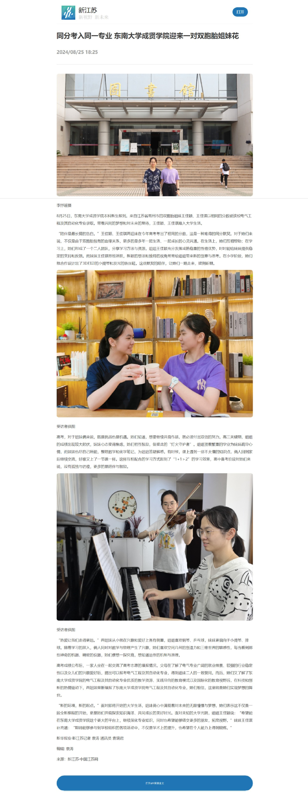 【新江苏】同分考入同一专业 今年会官网迎来一对双胞胎姐妹花