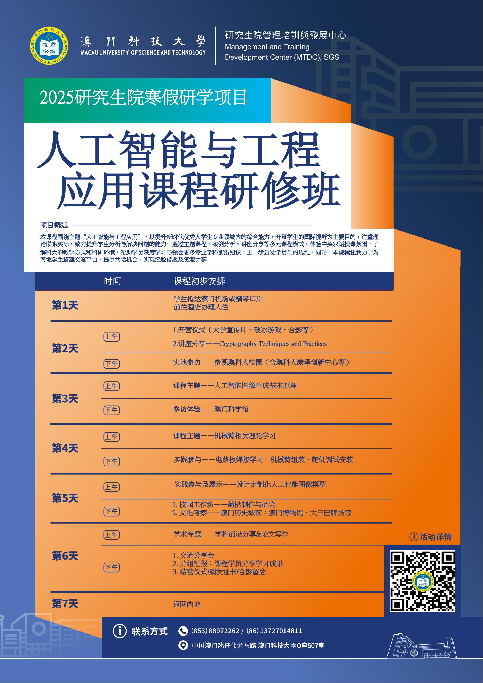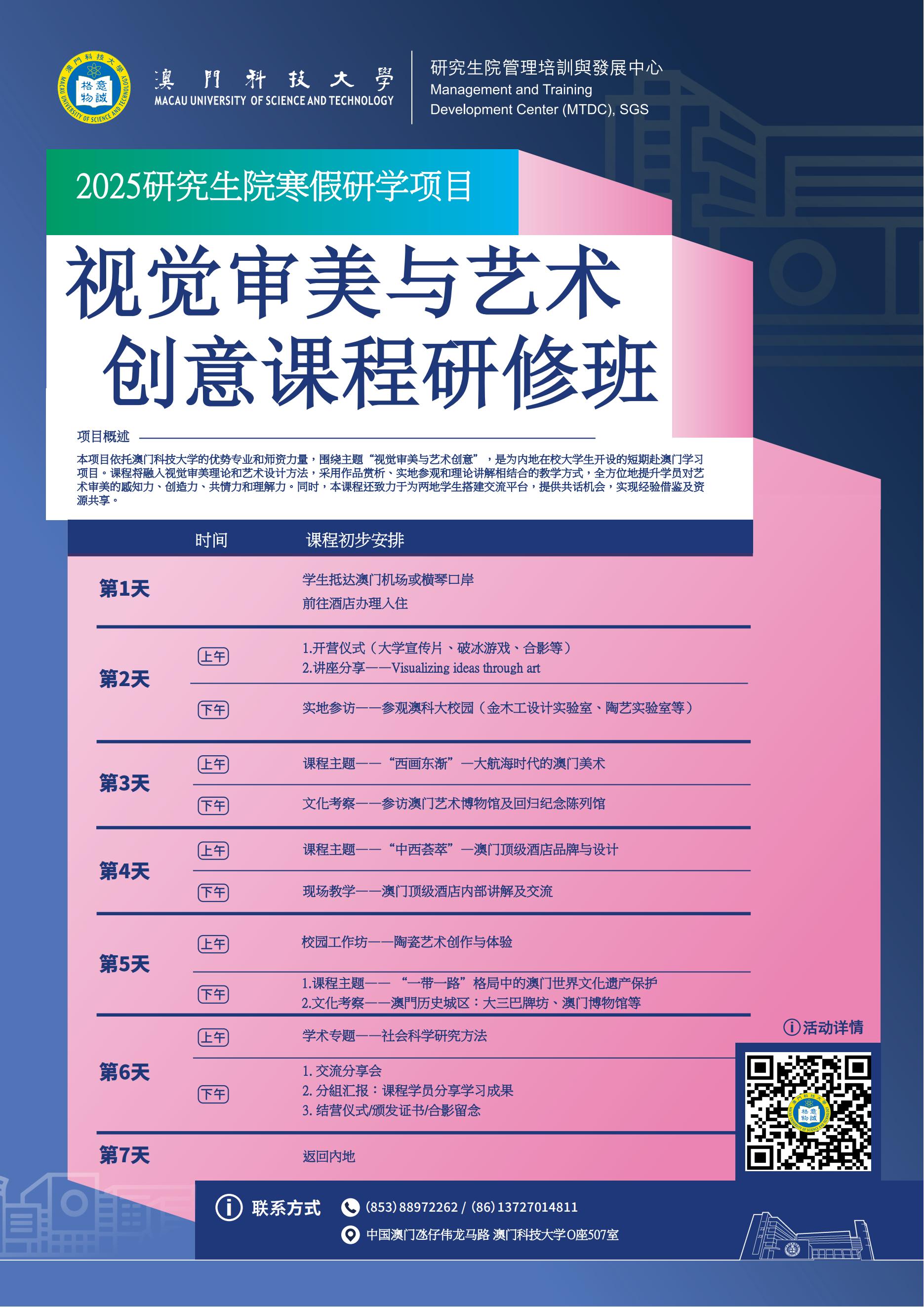 课程详情请见附件正文《2025年澳科大寒假大学生培训方案》,也可同时可扫描下方二维码进入微信公众号:澳科大MTDC,点击项目推文《行而致知/ 2025年澳科大寒假研學項目開啟報名!》了解。