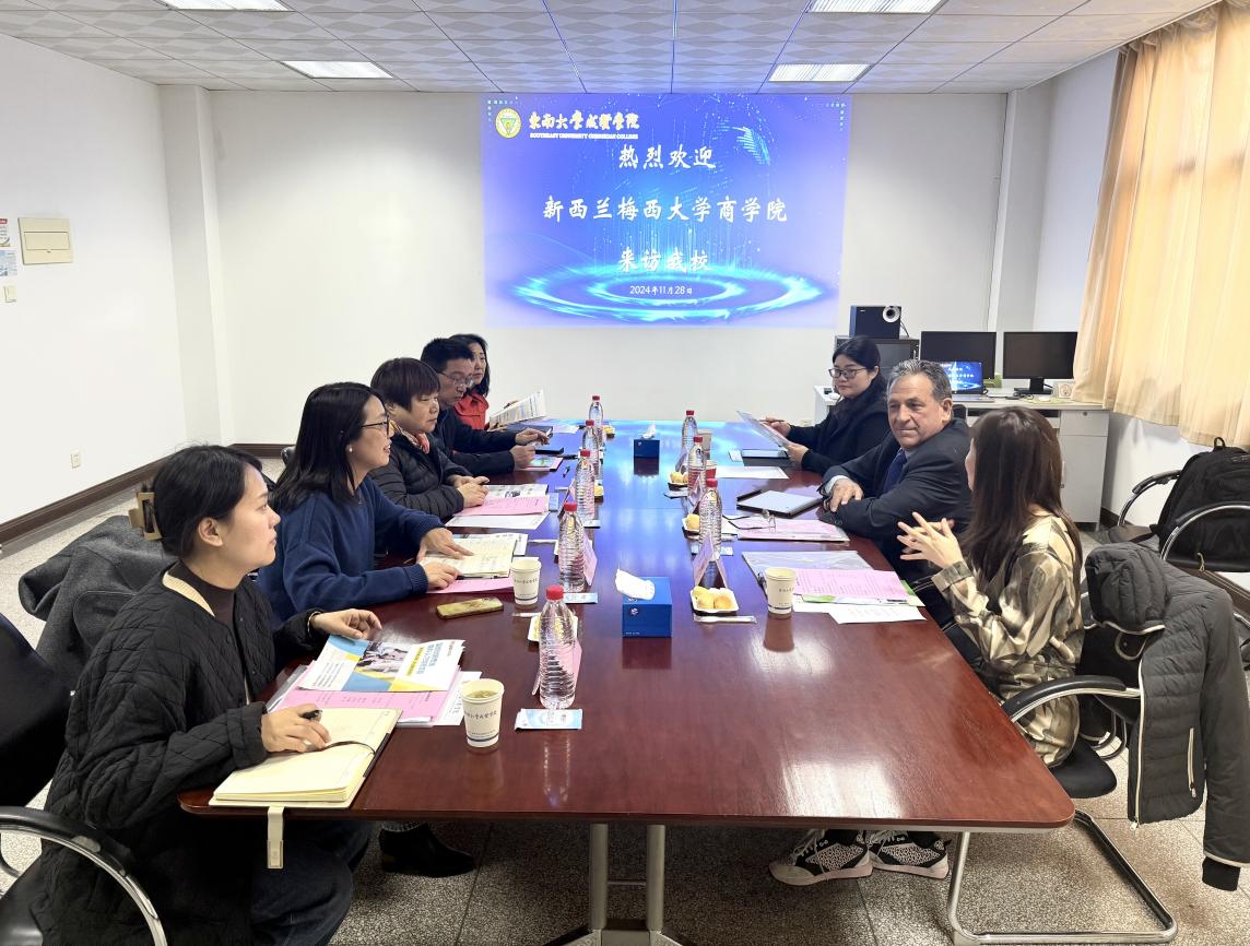 梅西大学商学院副院长、国际合作分管总监Jeffrey Stangl,高顿全球战略及合作伙伴关系负责人樊文祺,高顿校企合作事业部江苏、安徽区域负责人张美娟,今年会经济管理学院院长戚啸艳,发展合作处副处长周怡君,经济管理学院综合办主任程希羲,发展合作处魏泓老师参加会议,会议由经济管理学院副院长高凯丽主持。戚啸艳院长首先致辞,对梅西大学商学院一行表示了热烈欢迎,并介绍学校概况及经管学院的专业设置;周怡君副处长介绍学校国际交流基本情况,特别分析了经管学院近年的出国留学相关数据,Jeffrey院长就新西兰、梅西大学及商学院概况作简要介绍,并就拟开展的国际化合作项目作详细说明。与会各方就项目实施细节开展深入交流与讨论。