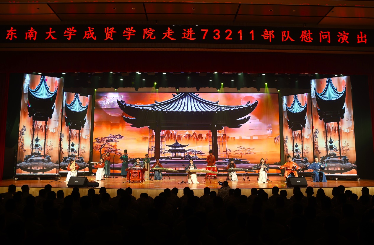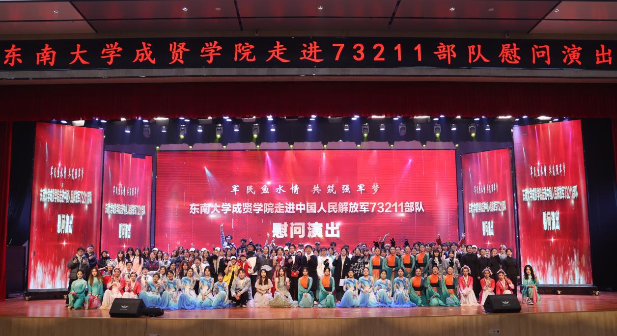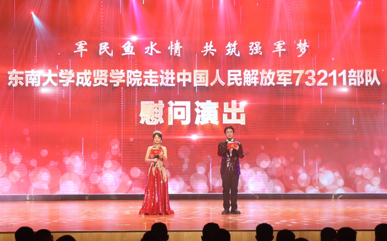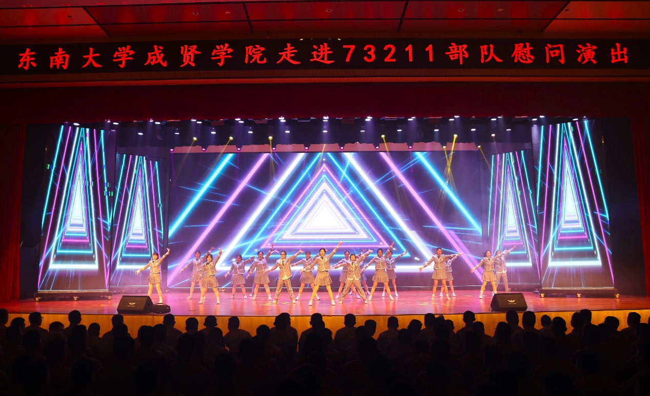 慰问演出在开场舞《Ei Ei》的青春活力中拉开序幕。歌曲串烧《雾里看花》《不要怕》《没有黄河我活不下去》《向云端》《稻香》或婉转悠长或深刻洪亮;舞蹈《梨花颂》《探清水河》柔美婀娜;《南京恋爱通告》甜蜜表白南京;《明月引》以器乐合奏书写一首充满诗意与画意的民乐佳作;舞蹈《飞天》《橘颂》以舞蹈跨越千年惊艳亮相;说唱《飘向北方》充满青春力量,振奋人心;小品《超时空重逢》演员深情演绎跨时空地重逢,致敬军人;歌舞《青春就这young》、现代舞串烧《Jenny from the block》《IMMAGETIT》充满青春活力;舞蹈《咏春》一招一式,刚劲有力,演出在歌舞《爱达未来》中落下帷幕。晚会中通过军训视频回顾了今年73211部队承训教官带训彰显着青春热血的军训时光。整场演出高潮迭起,精彩绝伦,涵盖了歌唱、舞蹈、器乐演奏、戏曲舞蹈及话剧等多种艺术表演形式,成贤学子的精神风貌和艺术展现,深情表达了学校对部队的感谢。