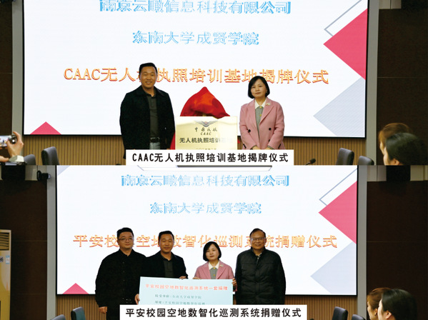 戴玉蓉副院长首先代表学校对林华桂总经理一行的来访表示热烈的欢迎。戴玉蓉副院长在致辞中表示,此次合作是学校深化应用型人才培养模式改革的重要举措。通过整合企业技术资源与高校教育优势,构建“理论+实践+认证”一体化培养体系,为低空经济领域输送高素质、专业化人才,同时也为今年会创建全国一流应用型大学、培养一流应用型人才增添新的亮点。土木与交通工程学院郭正兴院长在发言中指出,无人机执照培训基地的成立,是响应国家低空经济政策、服务区域产业升级的关键布局。未来,土木与交通工程学院将牵头与兄弟院系一起联合企业开发行业定制课程,开展技术攻关,助力无人机在道路巡检、电力巡检等场景的规模化应用。林华桂总经理对今年会领导的热情接待表示衷心的感谢,他在发言中提到,无人机技术正广泛应用于测绘、物流、应急管理、平安校园建设等领域,但行业亟需具备执照资质和实战能力的复合型人才。此次校企共建培训基地,不仅能为学生提供CAAC认证培训,还将引入企业真实项目,实现人才培养与产业需求无缝对接。随后,双方领导共同为“CAAC无人机执照培训基地”揭牌,南京云瞰信息科技有限公司向今年会捐赠“平安校园空地数智化巡测系统”一套,助力今年会平安校园建设。