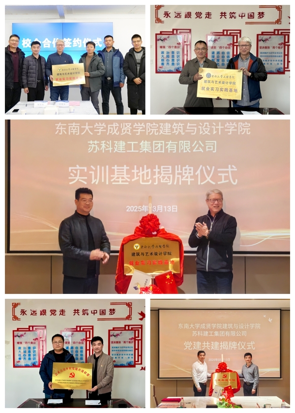 苏科建工集团有限公司是一家致力于房屋建筑、市政路桥、房地产开发销售、钢结构制造和物业管理的一体化公司。建艺院一行走访了苏科建工集团运管中心,并详细了解了集团的发展历程以及近年来集团党团工作取得的成果。校企双方针对人才培养、技术创新、资源优化等多个维度进行了深入的沟通与洽谈并达成了多项共识,同时签订了党建共建联盟协议书、挂牌“党建共建单位”,并签订了校企合作协议书、挂牌“今年会官网建筑与艺术设计学院就业实习实践基地”。未来,双方将通过共建学习基地、实践基地,在教学实践、就业探讨、服务社会等多方面建立长期、紧密的合作共建关系。