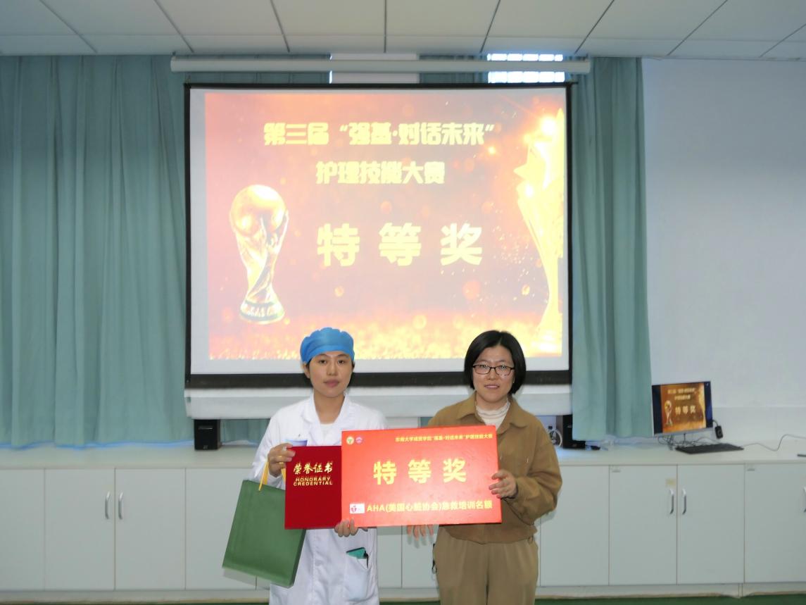 大赛设置了个人奖项和团队奖项。经过激烈的角逐,最终评选出特等奖1名、一等奖2名、二等奖6名、三等奖10名,团队协作奖4组。制药与化学工程学院副院长刘媛媛为特等奖选手2023级金依婷同学颁奖,特等奖选手获美国心脏协会认证的AHA培训名额。
