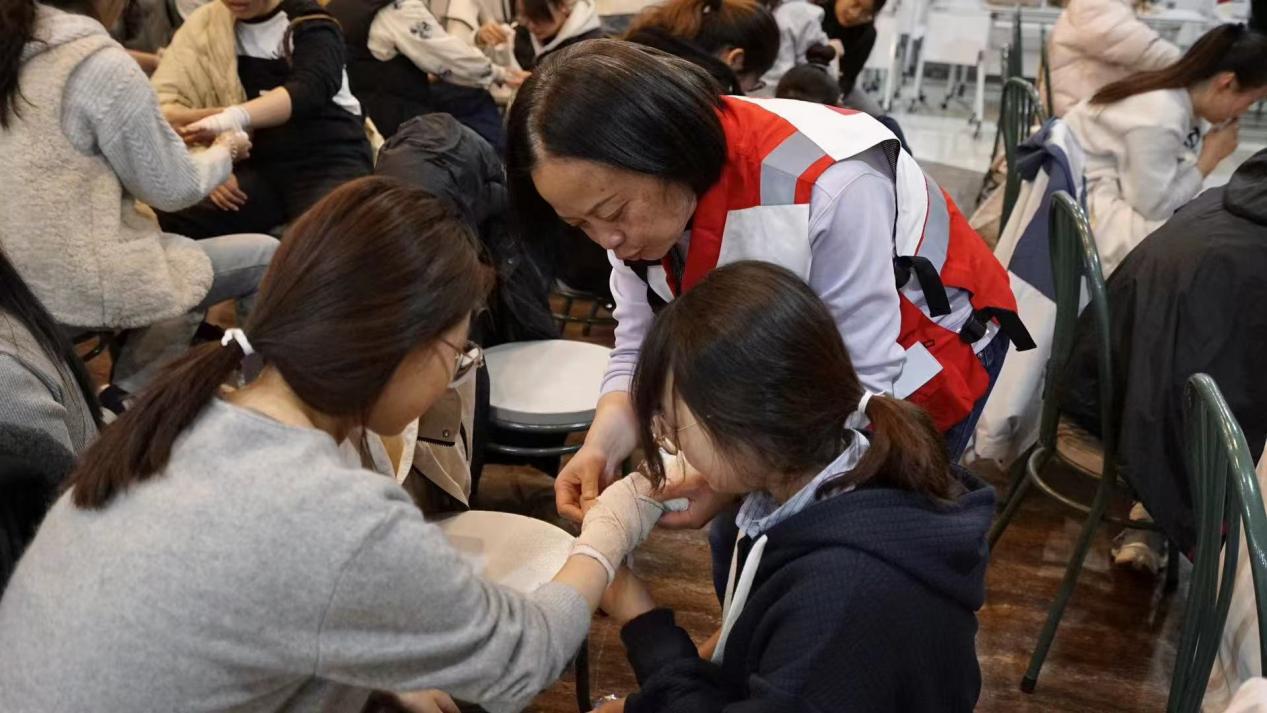 马薇蓉老师则从理论与实践双维度入手,深入解读应急救护的定义,让同学们清晰理解其内涵;详细阐述应急救护的原则,如生命第一、科学施救等,帮助同学们树立正确的救护理念;全面分析常见创伤类型,包括擦伤、刺伤、骨折等。随后,马老师针对创伤救护的八项实操技能,例如伤口包扎、骨折固定等,进行分组指导,手把手教学,确保每位同学都能掌握动作要领。严格开展考核,助力同学们熟练掌握创伤救护技能,最终,所有学员均成功通过考核。