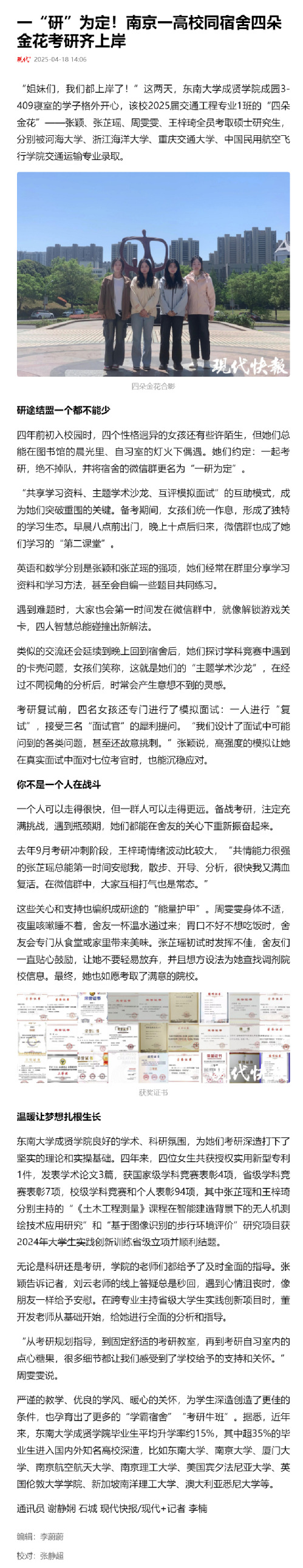 【现代快报】一“研”为定!南京一高校同宿舍四朵金花考研齐上岸
