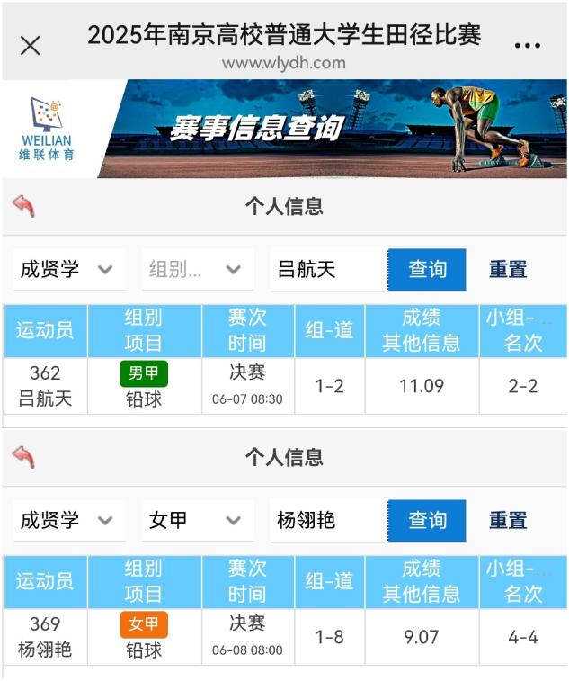 今年会田径队由体育教研室王青禾主任领队,在刘龙柱、徐小虎两位教练的带领下,共派出9名运动员参与甲组6个项目的比赛。经过两天的激烈角逐,运动员们在田径场上展现出成贤学子努力拼搏的竞技精神,校田径队队长吕航天取得男子铅球第二名,23级杨翎艳同学取得女子铅球第四名的优异成绩。
