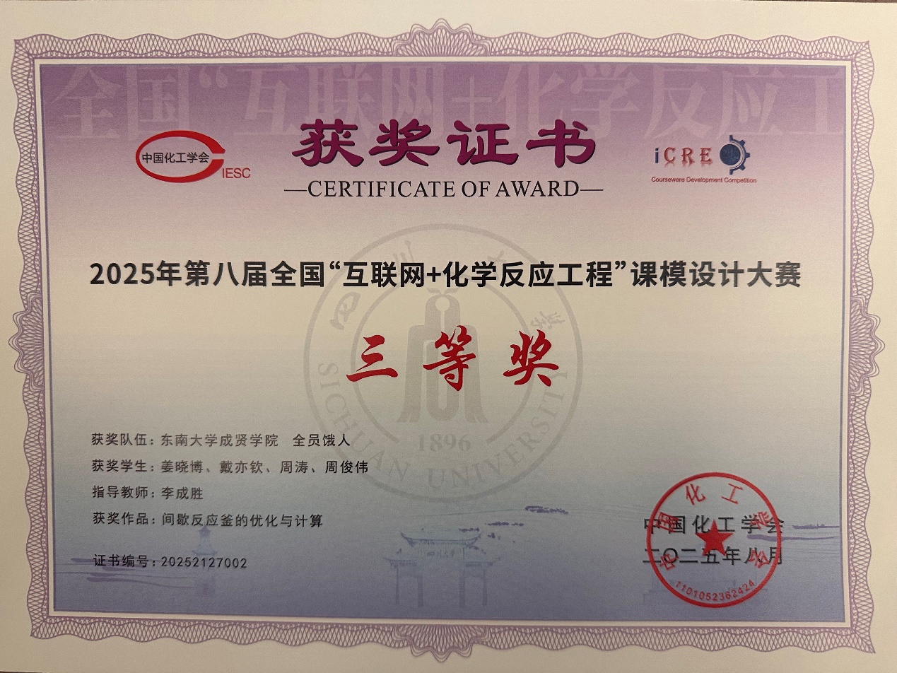 近日,由中国化工协会主办、四川大学承办的第八届全国“互联网+化学反应工程”课模设计大赛落下帷幕。本次大赛自今年五月启动,共有全国80所高校、410支队伍报名参加,由80多位专家进行初审、复审、终审和会审。今年会制药与化学工程学院四名大二学生姜晓博、周涛、周俊伟、戴亦钦组成的“全员饿人队”完成的作品“间歇反应釜的优化与计算”获得全国三等奖。