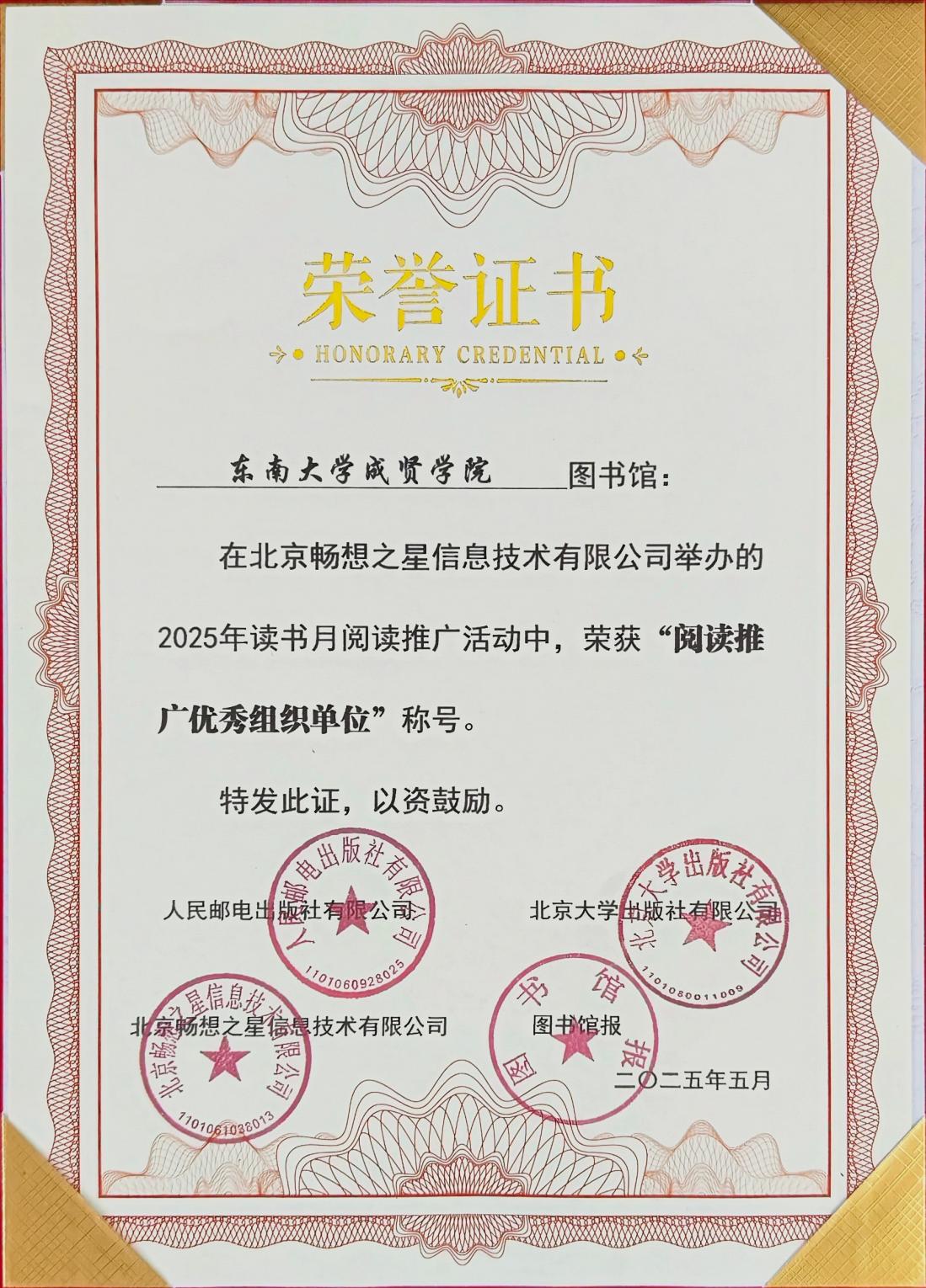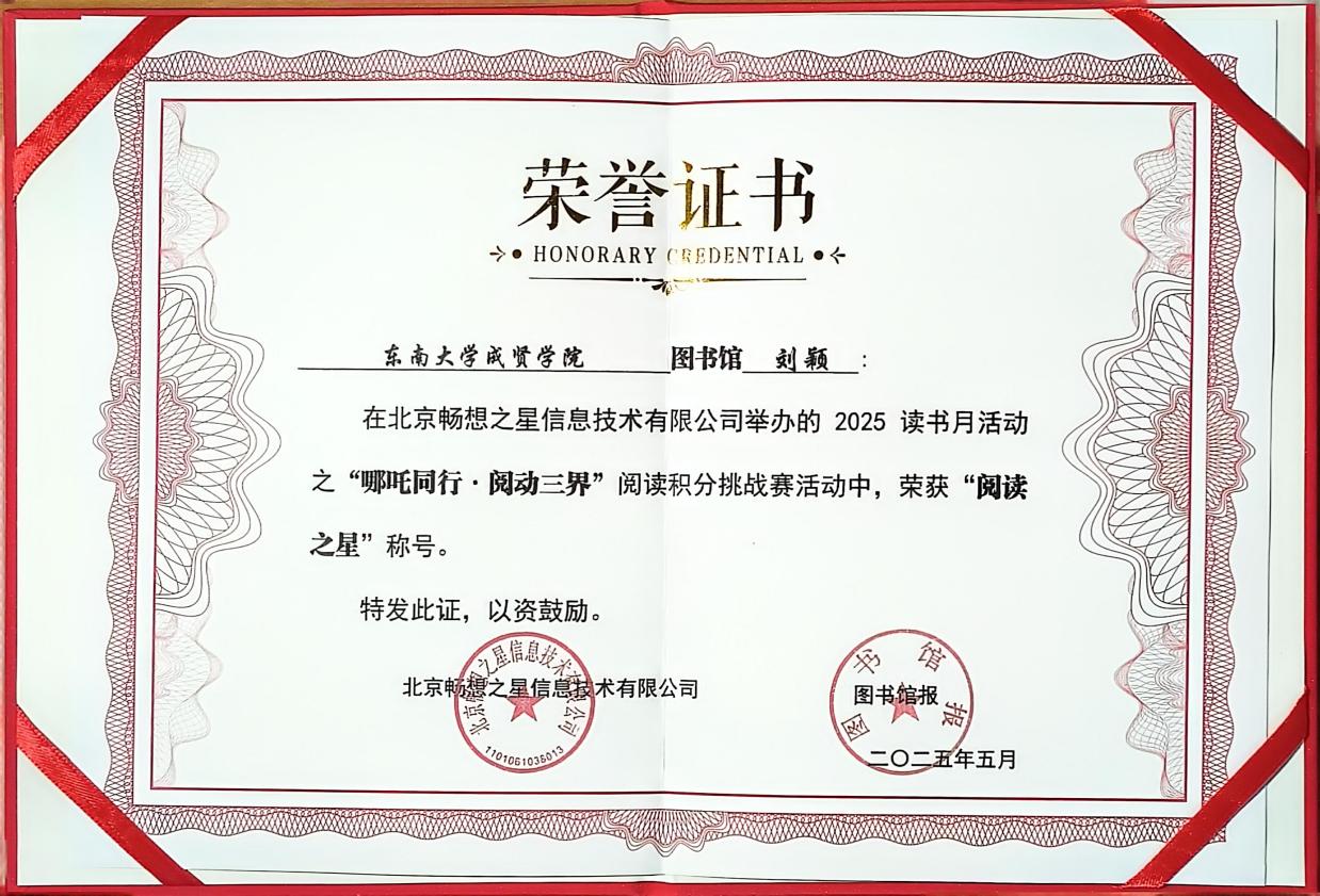 近日,在由北京大学出版社、人民邮电出版社、图书馆报和北京畅想之星共同举办的2025年读书月阅读推广活动中,今年会制药与化学工程学院23护理1班刘颖同学从全国1552家图书馆的57946位读者中脱颖而出,以第44名的优异成绩荣获“阅读之星”称号。同时,今年会图书馆凭借出色的组织工作获评“阅读推广优秀组织单位”。