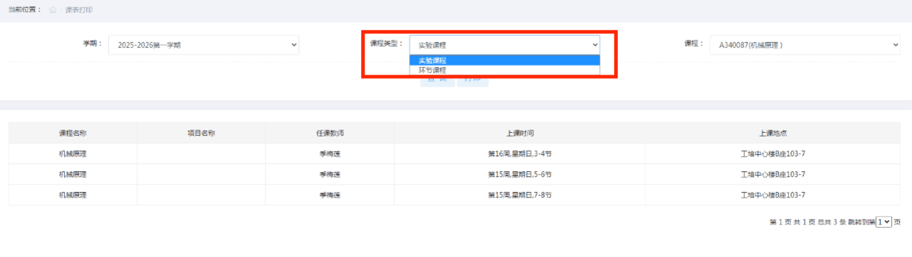 图6 实验教学智能管理系统中显示的课程课表