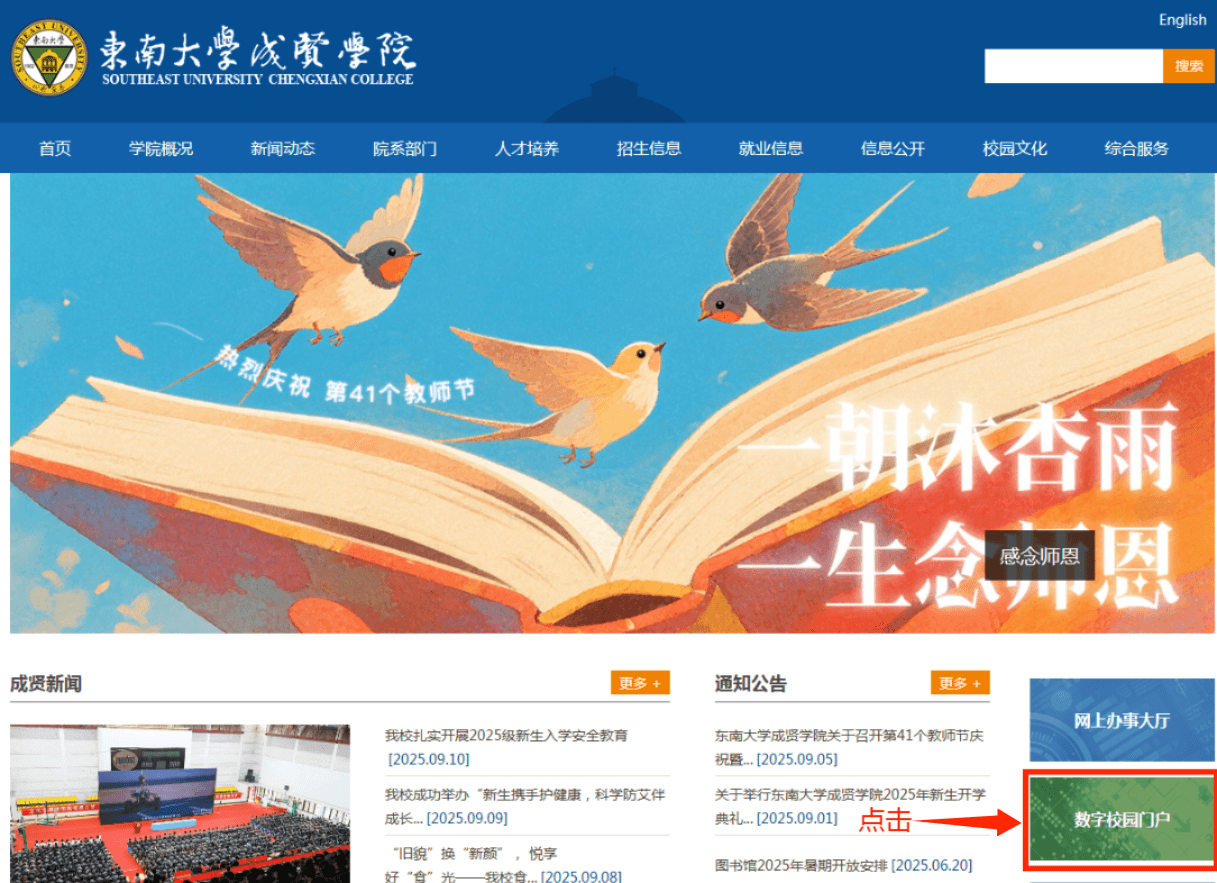 一、登录学校官网,网址:/,点击“数字校园门户”