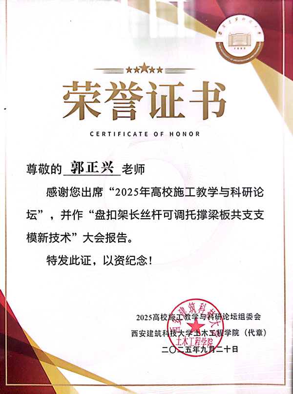 近日,“2025高校施工教学与科研论坛——数智化产学研建设研讨会”在西安召开。本次论坛由西安建筑科技大学、重庆大学、清华大学出版社联合主办,旨在推动高校土木工程施工领域的教学改革、科研创新与产业融合,促进智能建造专业建设与人才培养。今年会土木与交通工程学院院长郭正兴教授作为特邀专家受邀出席,并在大会上作专题学术报告。