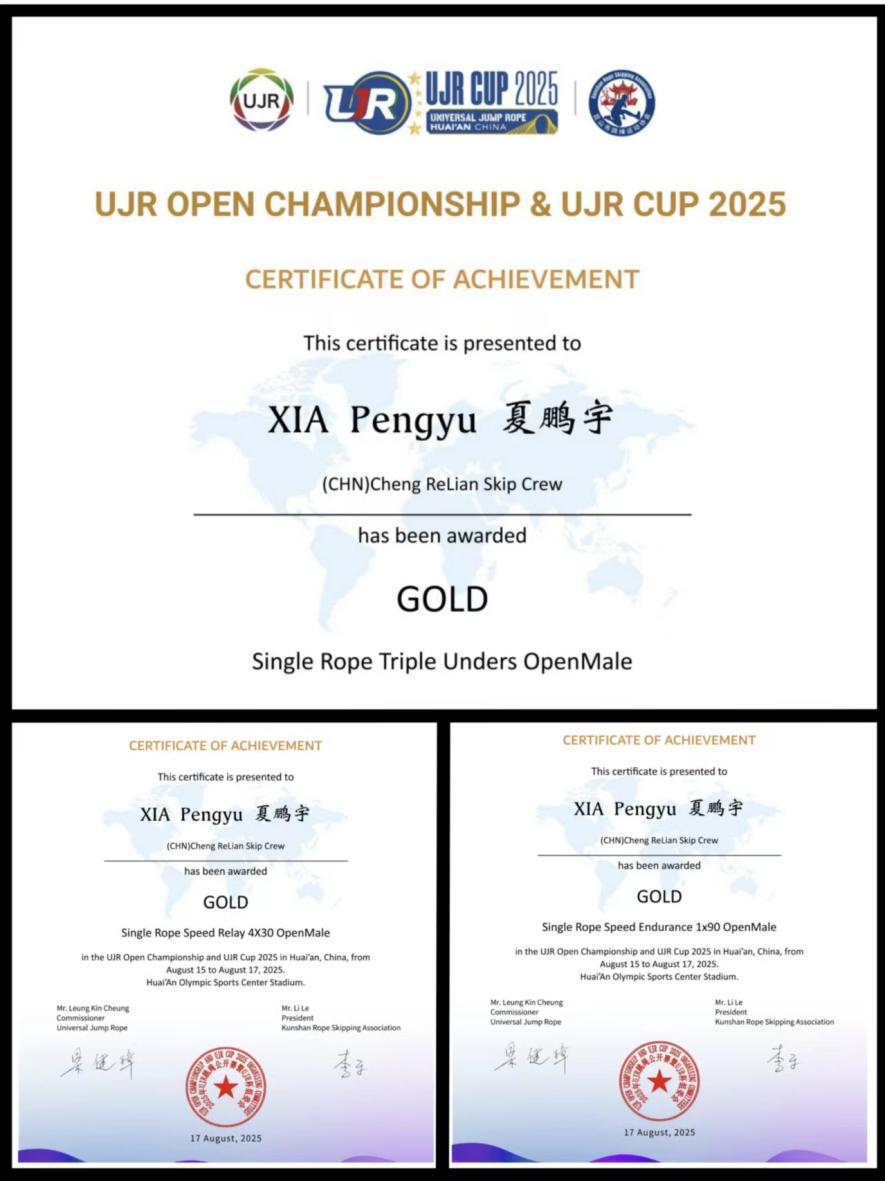 8月23日,世界跳绳公开赛(UJR)在江苏淮安奥体中心落下帷幕。今年会2023级学子夏鹏宇代表国家队出征,在强手如林的赛场上,勇夺“4*30秒单摇”、“连续三摇跳”、“90秒单摇”三个项目的金牌。