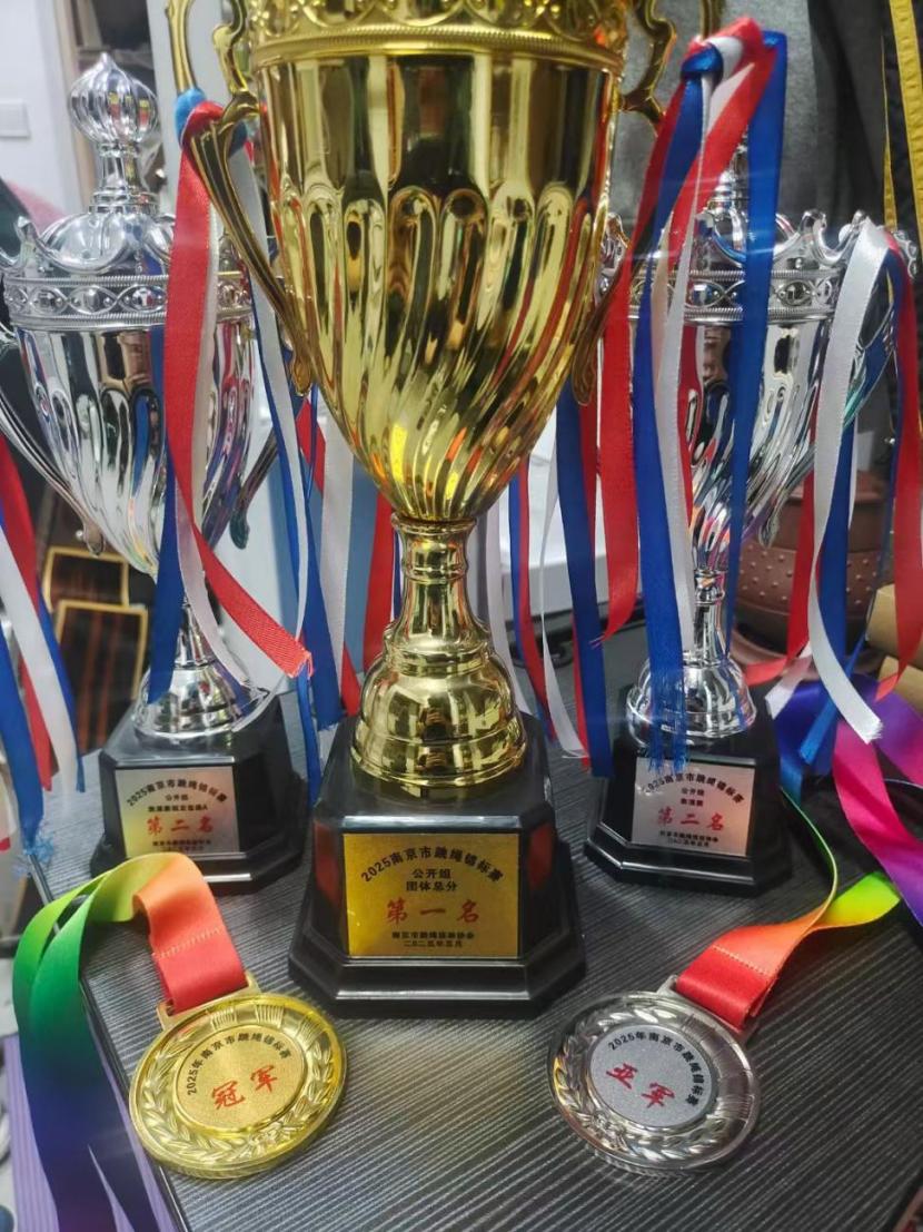 今年会花样跳绳队成立于今年2月,由体育教研室主任王青禾担任领队,2023级学子夏鹏宇担任教练兼队长,目前共有18名队员。经过几个月的刻苦训练,跳绳队便荣获南京市跳绳锦标赛、江苏省跳绳精英赛等比赛15个奖项。