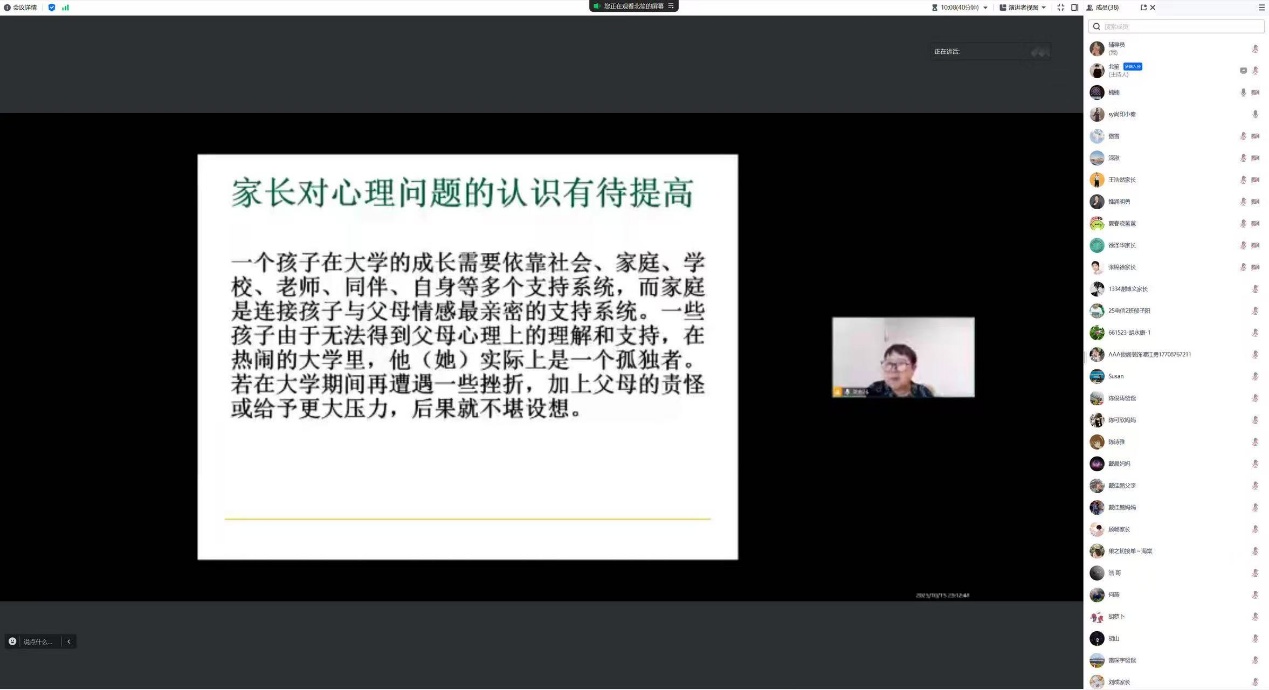 讲座中,郭晋林老师指出大学是人生重要转折期,新生需应对人际、学习、环境等多重变化,易产生焦虑、自我认同困惑等问题,而部分家长强加自身期望、忽视孩子心理需求的做法会加重其负担,缺乏家庭情感支持的学生还可能出现宿舍关系、网络成瘾等问题。对此,郭晋林老师建议家长给予孩子无条件理解与支持,摒弃说教、注重共情与自身成长,学校也将提供多元心理支持,家校合力助力学生以健康心态迎接挑战。