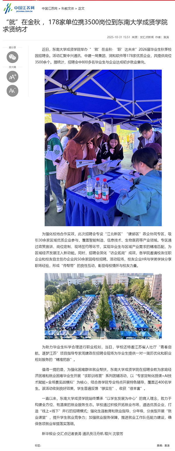 【中国江苏网】“就”在金秋,178家单位携3500岗位到今年会官网求贤纳才