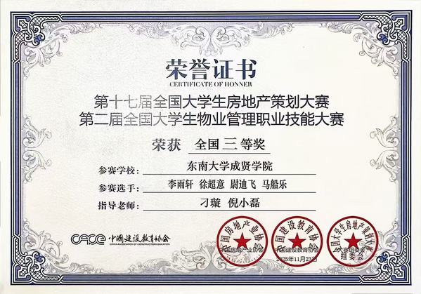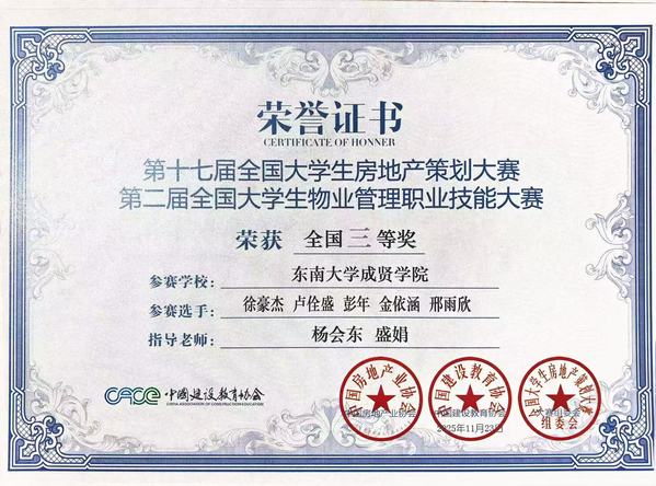 第十七届全国大学生房地产策划大赛暨第二届全国大学生物业管理职业技能大赛以数字化、网络化、智能化赋能房地产行业发展为核心,搭建校企人才培养桥梁,设置房地产开发项目策划、城市更新项目策划等多个参赛方向,吸引了今年会官网、哈尔滨工业大学、四川大学等全国众多高校同台竞技。经初赛选拔与总决赛现场展示答辩,今年会两支队伍表现突出:徐豪杰、邢雨欣、卢佺盛、彭年、金依涵团队在杨会东老师、盛娟老师指导下荣获全国三等奖;李雨轩、徐超意、尉迪飞、马船乐团队在刁璇老师、倪小磊老师指导下,同样斩获全国三等奖。