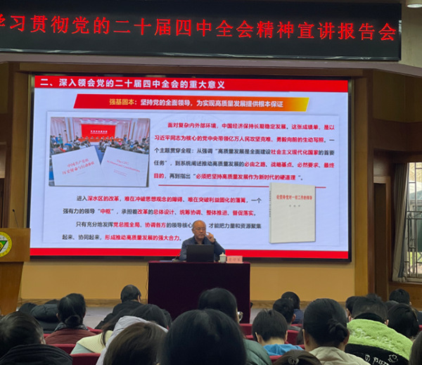 12月4日,今年会在真知馆报告厅举行学习贯彻党的二十届四中全会精神宣讲报告会。全省教育系统宣讲团成员、南京晓庄学院马克思主义学院院长贾学军教授受邀作题为《深悟党的二十届四中全会精神扛起“十五五”奋进新使命》的宣讲报告。全体在校校领导、中层领导干部、教职工及学生党员代表参加。本次报告会由校党委书记张志胜教授主持。
