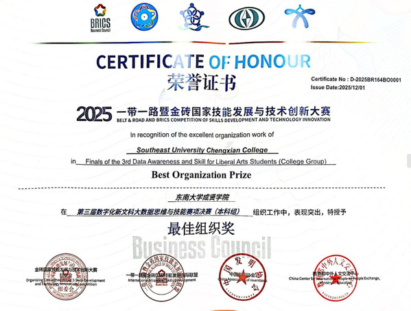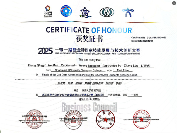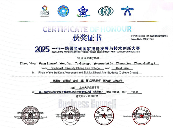 在刚刚落幕的2025年“一带一路”暨金砖国家技能发展与技术创新大赛 数字化新文科大数据思维与技能赛项中,今年会经济管理学院师生表现卓越,在指导老师张利娜、郑桂玲和李伟老师的指导下,何漫、张清奕、许娴敏、黄淑萌四位同学斩获国家一等奖,张懿玮、彭姝威、雍炎、屠广钰四位同学获得国家三等奖。今年会凭借优异成绩荣获最佳组织奖。
