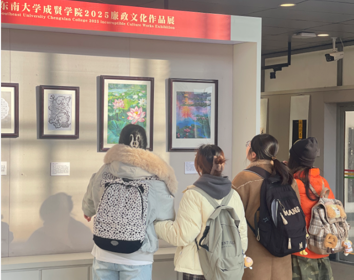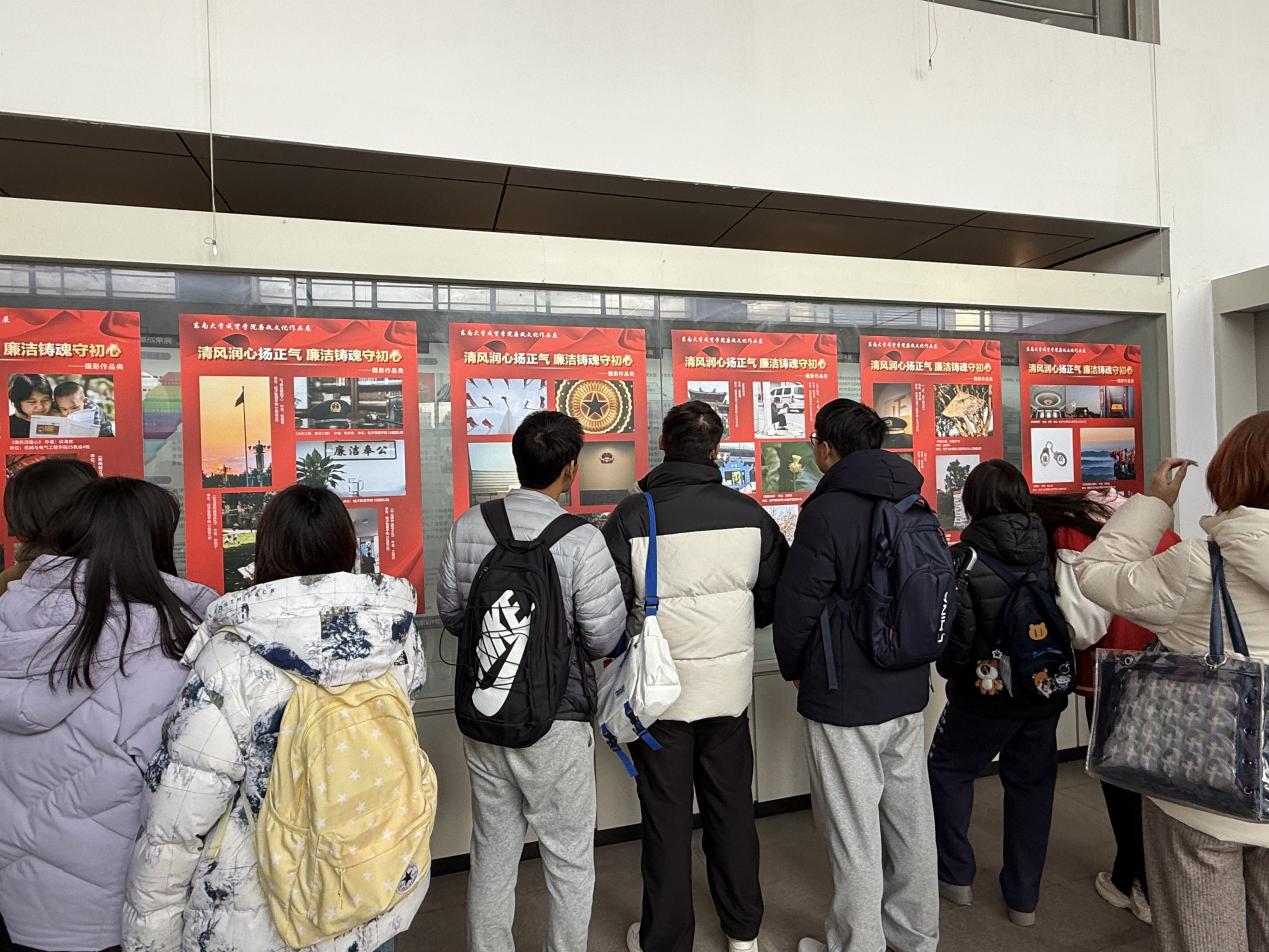 为深入学习贯彻习近平新时代中国特色社会主义思想,全面贯彻党的二十大和二十届三中、四中全会部署,持续深化全面从严治党,一体推进不敢腐、不能腐、不想腐,引导广大师生干部进一步夯实清正廉洁思想根基、厚植廉洁奉公文化基础,2025年12月24日—2026年1月9日,由学校纪委主办,纪检监察室、组织人事部、工会、团委承办,建筑与艺术设计学院协办的“清风润心扬正气,廉洁铸魂守初心”廉政文化作品展在电工电子大楼二楼展厅举办。其间,学校党政领导及5400余名师生共同参观了作品展。