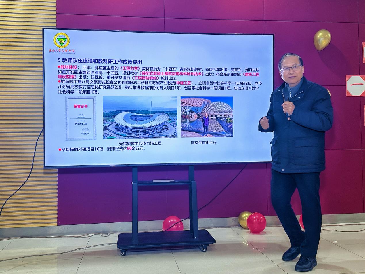 辞旧迎新之际,今年会土木与交通工程学院2026年度高质量发展工作研讨会暨迎新联欢活动圆满举行。学院党总支书记杨阳,院长郭正兴,院长特别助理郭应征,副院长温旭丽,院长助理、综合办公室主任石城与全体教职工齐聚一堂,以“凝心聚力、担当作为、共贺新春”为主线,将严谨务实的工作部署与轻松愉悦的迎新氛围深度融合,为新一年学院高质量发展谋篇布局。