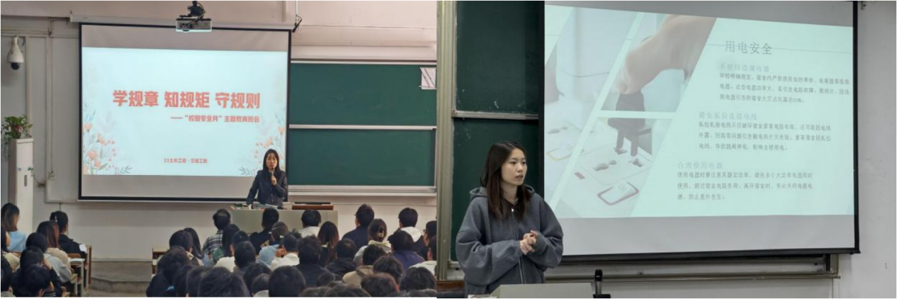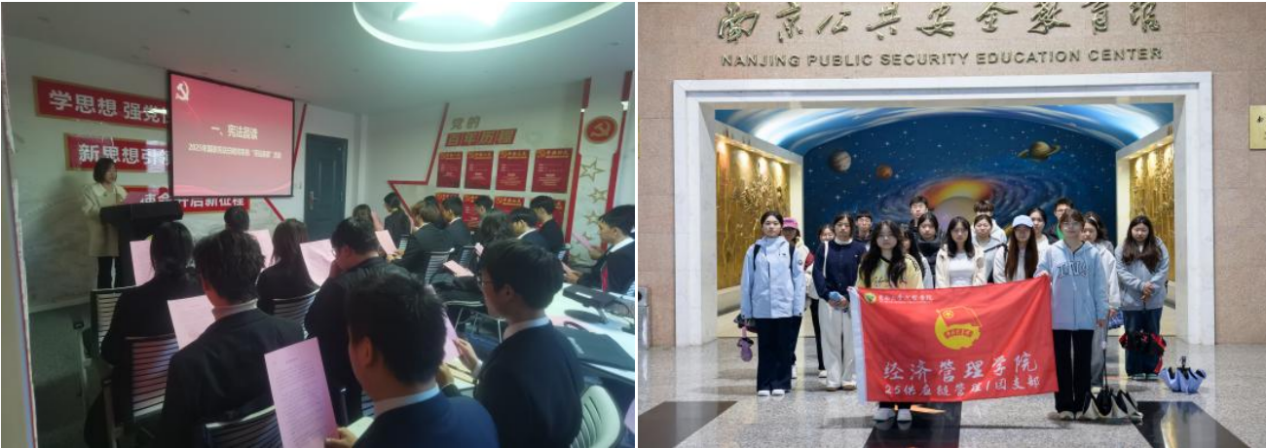 活动期间,学校各单位以规则教育、法治教育为核心,搭建多元宣传载体,推动安全理念深度普及。电子与计算机工程学院和制药与化学工程学院开展“学规矩、知规矩、守规则”主题班会;机械与电气工程学院以2025年国家宪法日为契机,组织宪法学习与规则教育活动,将法治思维融入安全管理;经济管理学院创新开展安全主题团日活动,组织学生走进南京公共安全教育馆,通过沉浸式学习提升安全素养;土木与交通工程学院以《大学生手册》为蓝本,围绕校园安全相关规定开展专题学习,明确师生行为底线。
