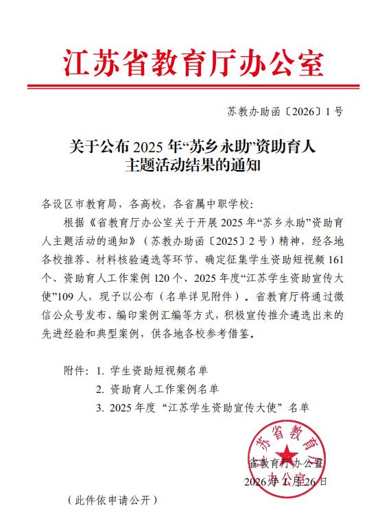 由江苏省教育厅主办的“苏乡永助”资助育人主题活动,旨在宣传国家资助政策和资助育人成效,引导学生树立正确的世界观、人生观和价值观,着力培养受助学生自立自强、知恩感恩、勇于担当的良好品质。我校高度重视此次活动,广泛动员师生参与作品创作,深度发掘资助典型。