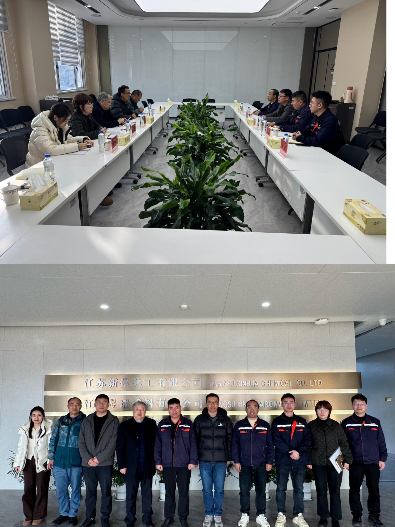 (与江苏新化化工、江苏馨瑞香料、江苏兴福电子开展座谈并合影)